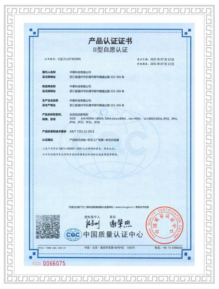 **質量認證產品認證證書